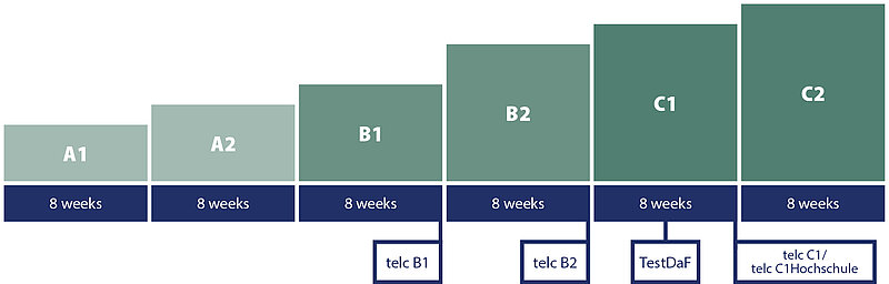 Before the start of each course, we conduct a placement test and a personal interview to determine your language level. You then attend courses in that level and can set and monitor your personal language learning goal using the following diagram.